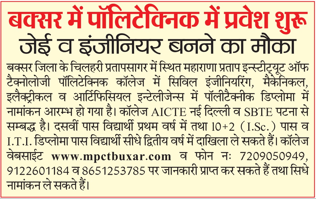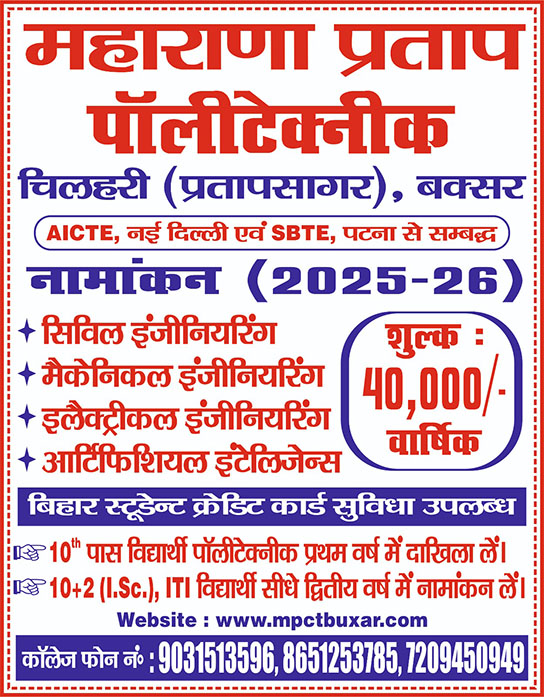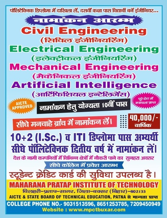Maharana Prtap Institute of Technology was established by renowned and philanthropic people with an objective of providing education to all especially the down trodden and rural population. Considering the growing demands for technical education in the country the India Computer Education Society has started an college namely Maharana Pratap Institute of Technology, Chilhari, Buxar(Bihar) for the academic year 2024 – 2025.